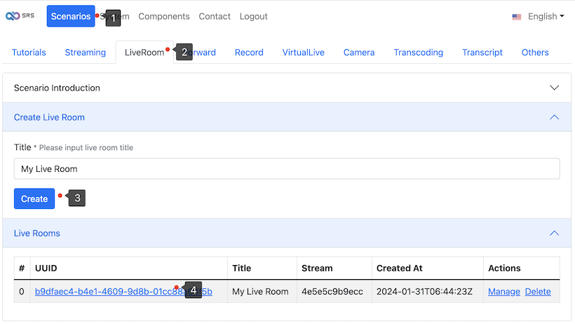 Next, as illustrated in the image below, navigate to Scenarios > LiveRoom > Create Live Room and press the Create button to create a live room for conversing with the GPT AI assistant. Alternatively, select the link to join an existing live room.